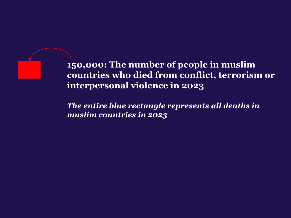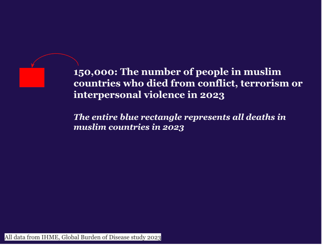 This may come as a surprise, but violent deaths are remarkably uncommon in the muslim world. In fact, out of everyone who died in a muslim country in 2023, only 1.1% died as a result of conflict, terrorism or interpersonal violence.