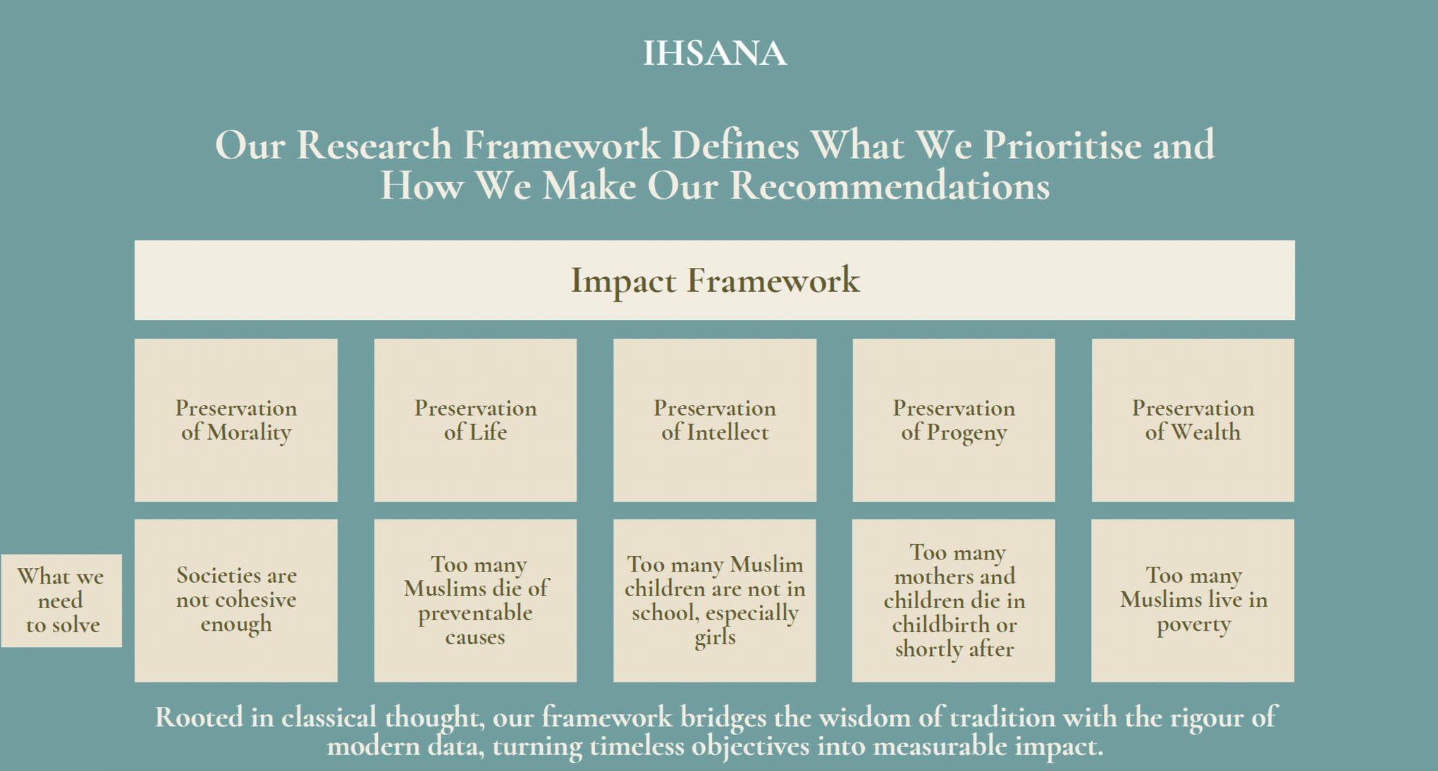 What will underpin all of Ihsana’s research? This matters, because all research rests on an underlying framework or set of assumptions. No research is value-neutral; bias is inevitable, and Ihsana is no exception.Our starting point goes back to 1090, when Imam Ghazali set out the higher principles of Islamic law or the مقاصد الشريعة, and it is timeless. I adopted it and applied some data points, turning it into "shariah on a spreadsheet."The framework is simple: it prioritizes the preservation of life, progeny, intellect, wealth and morality. From this, we will measure what the highest-burden issues are in the Muslim world.So why adopt this framework at all? Is it not outdated, a relic of another time? I do not think so. In fact, I would argue the opposite. In an age of polarised, fragmented societies, its unifying principles are more necessary than ever.Societies function best when they are cohesive, when they value the lives of mothers and children, when they invest in wealth creation and knowledge for the benefit of the nation as a whole, and when human life itself is treated as intrinsically valuable. These are not abstract ideals. They are the foundations of stable, prosperous societies.Where these principles are absent, we see the consequences clearly. Over 800,000 babies died in muslim countries before they reached 28 days old in 2023 and that is just scratching the surface.It is no coincidence that the wealthiest Muslim countries in the Gulf have placed societal cohesion at the centre of their national projects. By prioritising social stability, public welfare, and collective progress, they have been able to achieve some of the highest human development outcomes in the Muslim world and have escaped the resource trap.Our preliminary research yielded five hypotheses. They are simple:1. Our societies are not cohesive enough