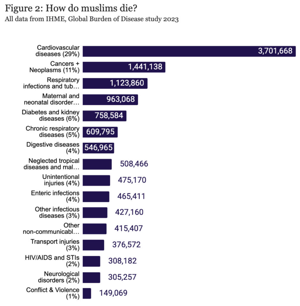 Why does this matter? Because 2025 was a brutal year for global conflict, and when viewed through the narrow prism of social media, it can begin to feel as though violence is the only story unfolding in the world.This is a distortion of reality and obstructs clear rational thinking about other critical, non-violent issues that are widespread and, crucially, solvable in muslim countries. This is not to undervalue the very real and tragic events unfolding worldwide, but to use data to provide a broader and more balanced perspective.At Ihsana, the preservation of life is our highest priority. That raises two essential questions: what does the data tell us about how muslims actually die, and what should that mean for the priorities of donors and charities seeking to prevent avoidable loss of life?
